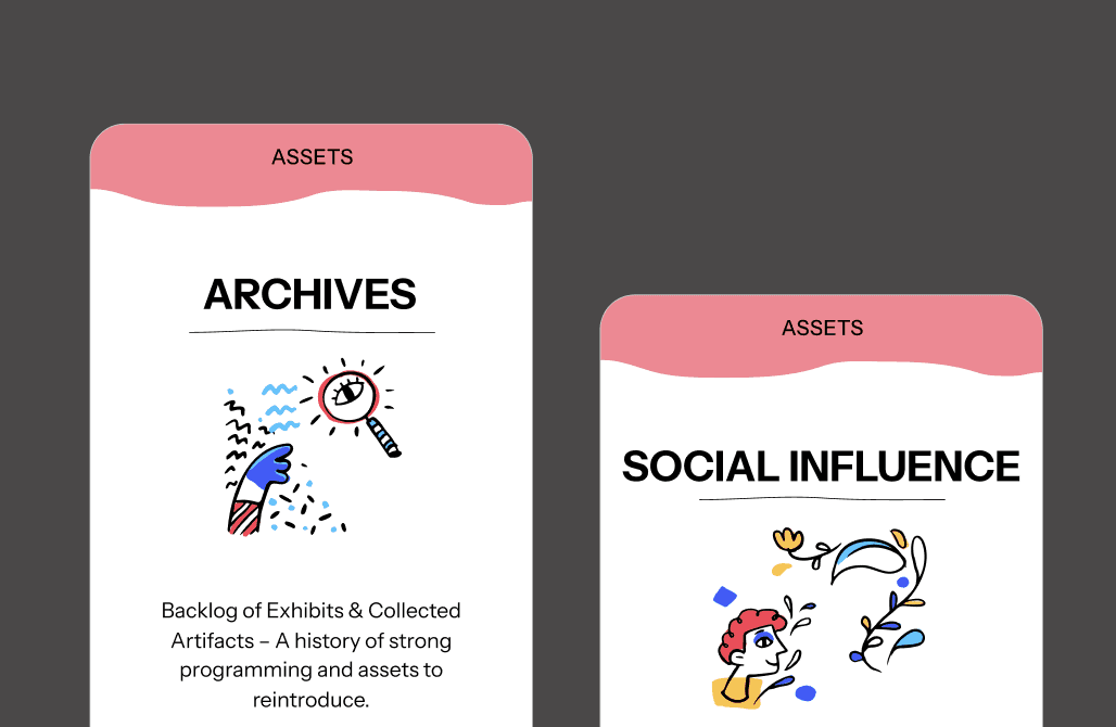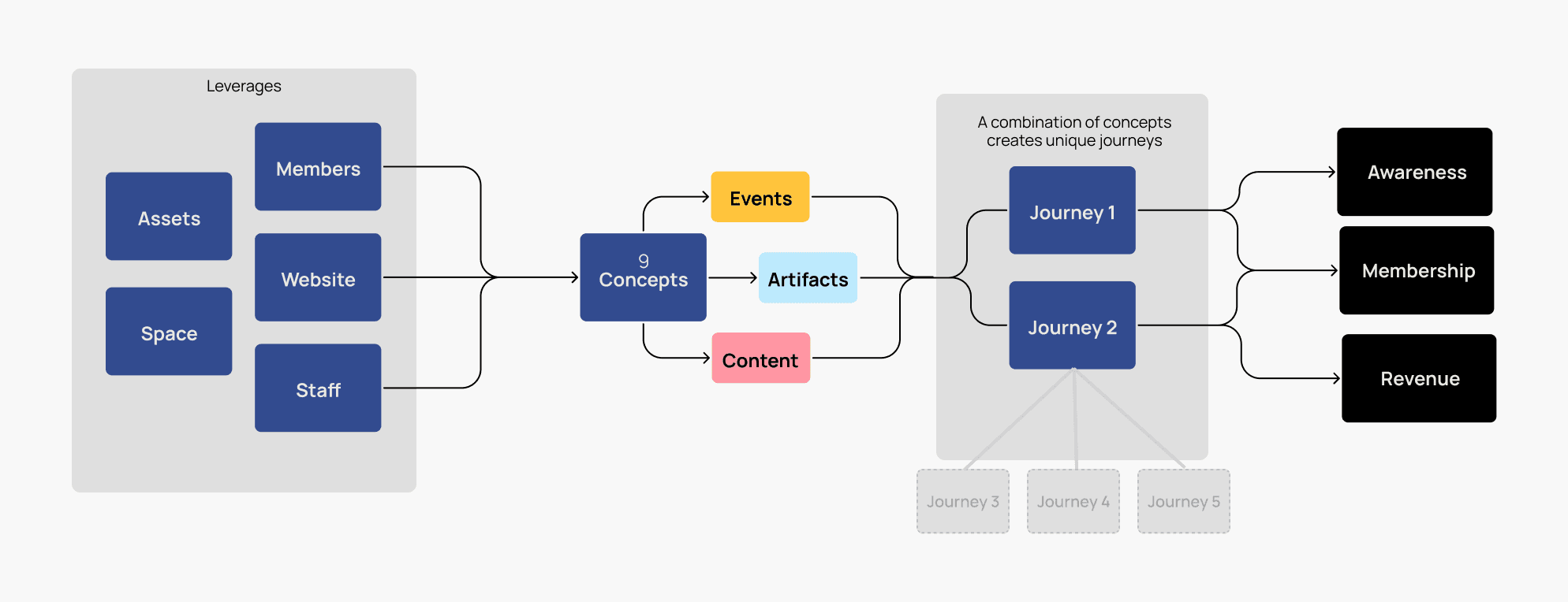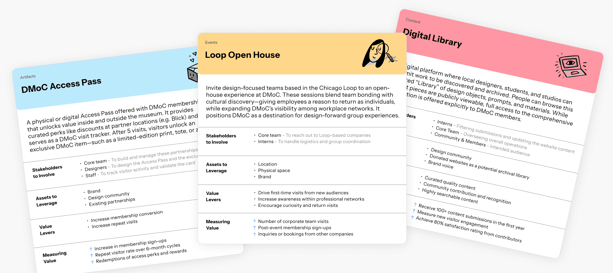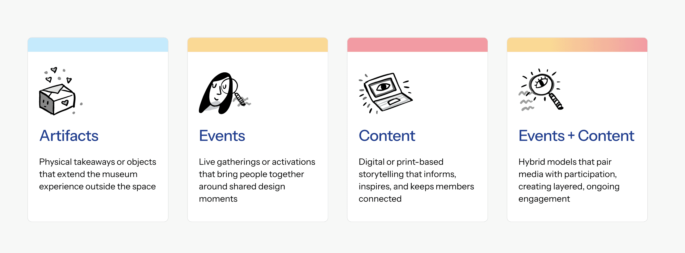 To make the ideas more actionable, we created 9 'Concept Cards'. The concepts were grouped by how they engage members and visitors, whether through physical objects, shared experiences, storytelling, or hybrid models.