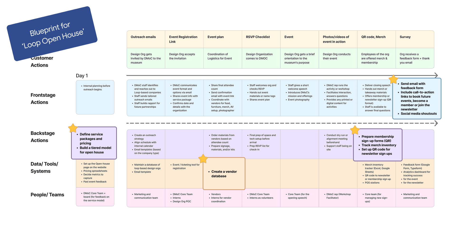 This project resulted in a reusable framework to guide future visitor journeys and strategic decision-making at DMoC. Co-creation workshops helped align stakeholder priorities and audience needs. This led to a future-state ecosystem of 6 service blueprints tied to the museum’s core growth objectives.