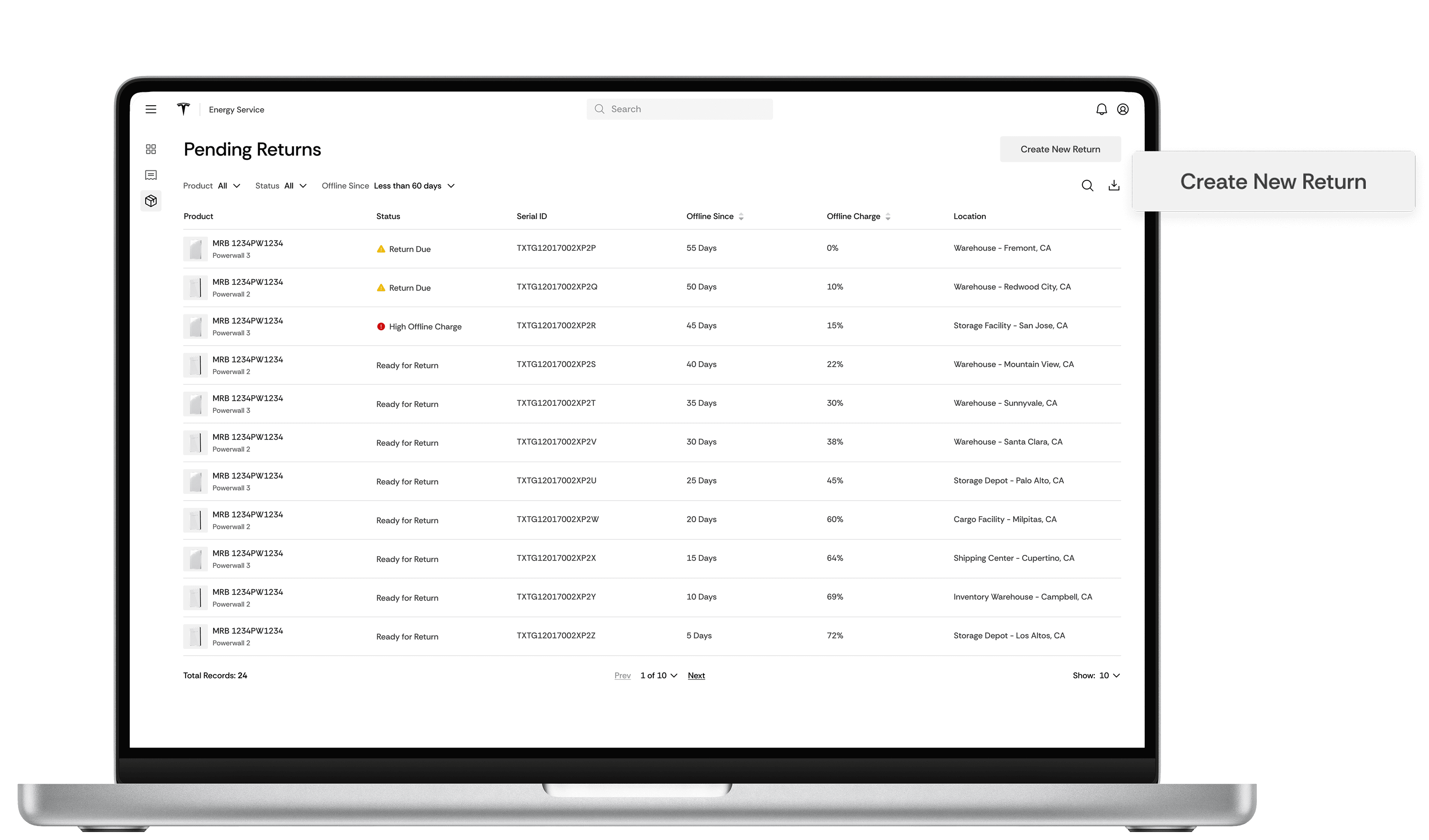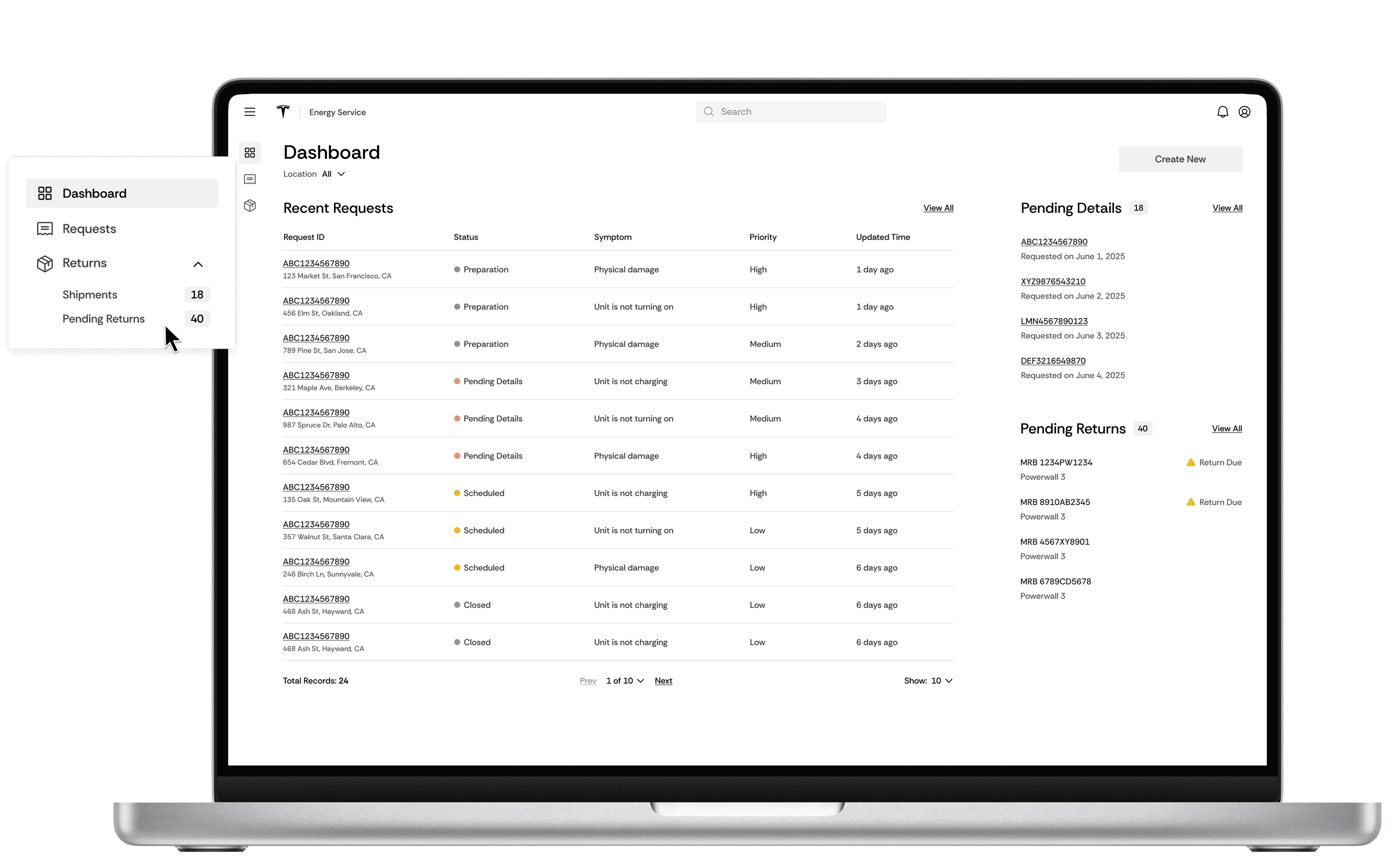 Enabling Tesla’s energy partners to return faulty assets back to Tesla through a simplified, previously fragmented returns workflow.