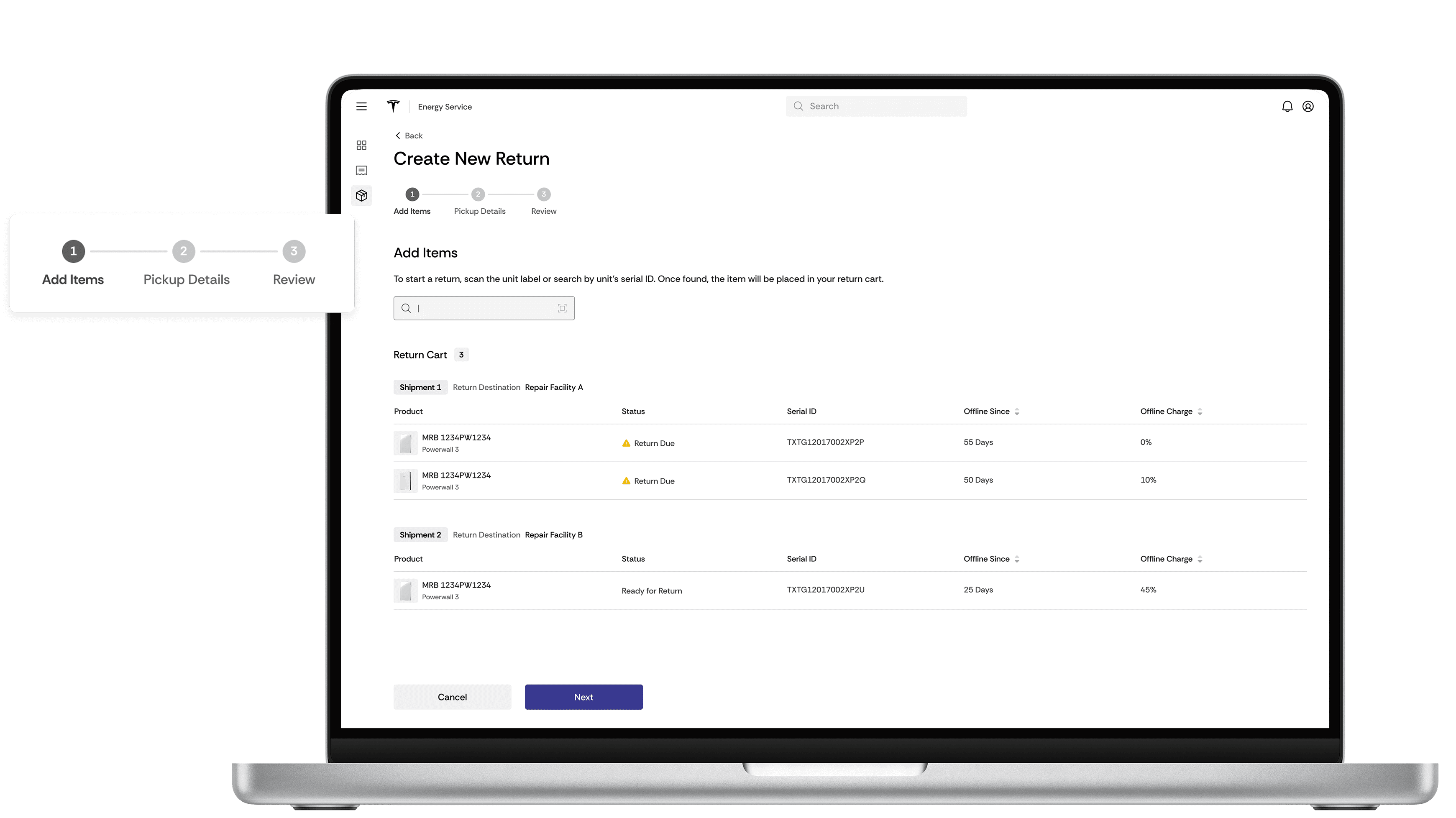 With the stepper flow, scan or search by serial ID to add products to the return cart, then proceed to enter pickup details and review before finalizing.